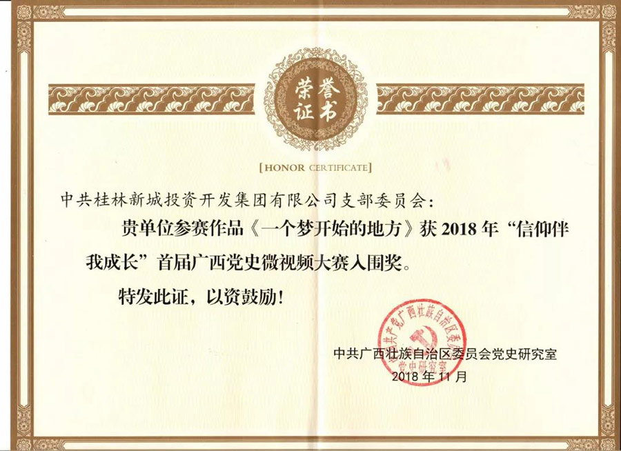 近日,在廣西壯族自治區(qū)黨委黨史研究室、廣西電視臺主辦的“信仰伴我成長”首屆廣西黨史微視頻大賽頒獎(jiǎng)儀式上,新城投資集團(tuán)黨支部選送的參賽作品《臨桂新區(qū) 一個(gè)夢開始的地方》榮獲入圍獎(jiǎng)。