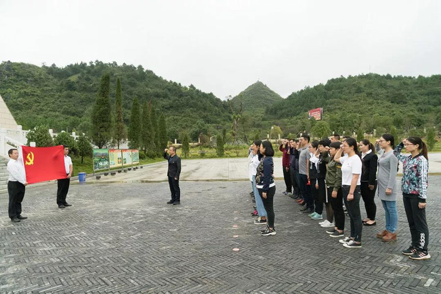 隨后,全體黨員來(lái)到湘江戰(zhàn)役新圩阻擊戰(zhàn)酒海井紅軍紀(jì)念園,學(xué)習(xí)了解了紅軍突破湘江的歷史。兩名黨員代表為烈士敬獻(xiàn)了花圈,覃正東、周道林整理挽聯(lián),祭奠烈士英靈,全體黨員向革命烈士行三鞠躬禮,緬懷先烈,寄托哀思。最后,全體黨員在黨支部書記周道林的帶領(lǐng)下重溫入黨誓詞。