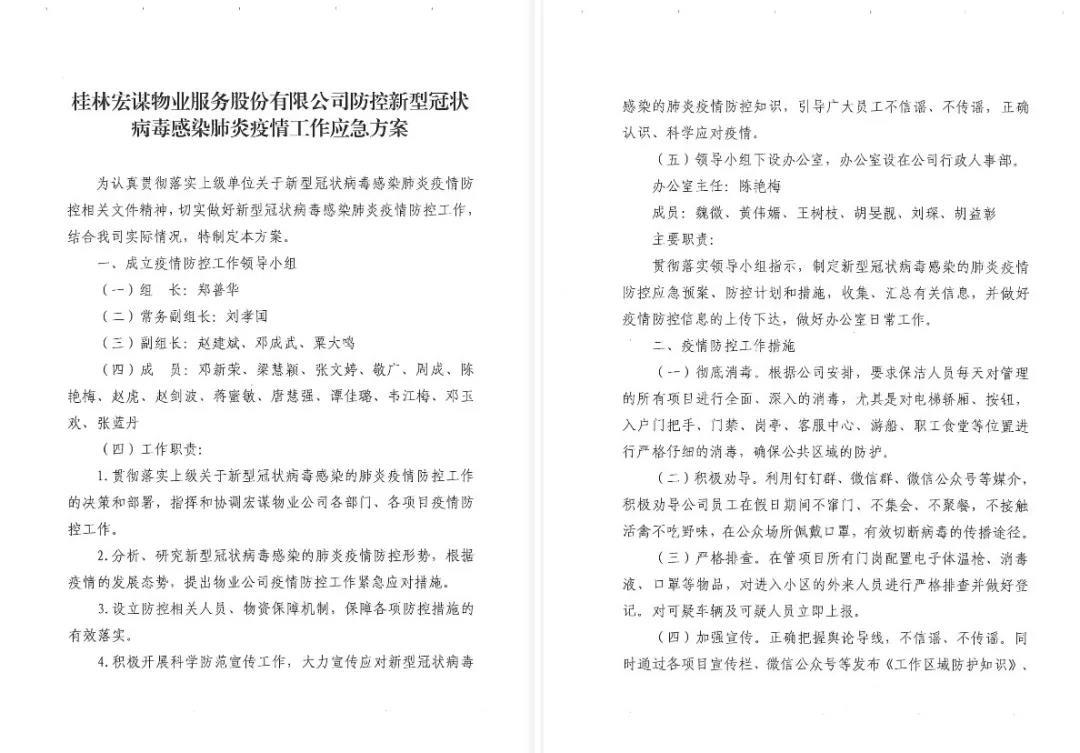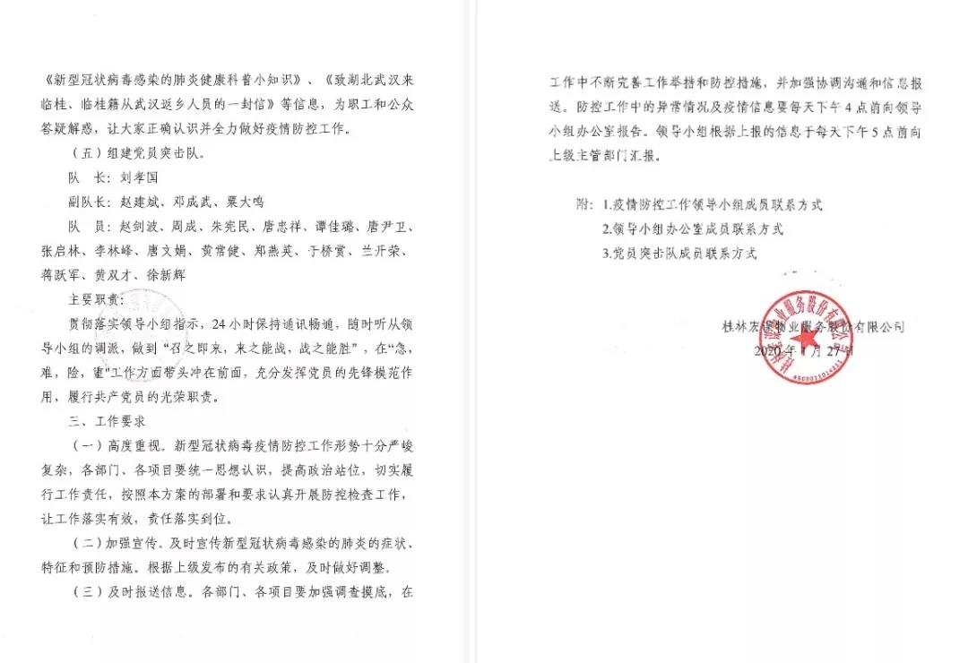 一、為認(rèn)真貫徹落實(shí)上級單位關(guān)于新型冠狀病毒感染肺炎疫情防控相關(guān)文件精神,將疫情防控工作落到實(shí)處,宏謀物業(yè)制定《桂林宏謀物業(yè)服務(wù)股份有限公司防控新型冠狀病毒感染肺炎疫情工作應(yīng)急方案》,成立疫情防控工作領(lǐng)導(dǎo)小組,以便統(tǒng)籌指揮協(xié)調(diào)相關(guān)工作。同時成立以總經(jīng)理劉孝國同志任隊(duì)長的物業(yè)公司黨員突擊隊(duì),在“急,難,險(xiǎn),重"等工作面前,黨員同志帶頭沖在前面,充分發(fā)揮黨員的先鋒模范作用,履行共產(chǎn)黨員的光榮職責(zé)。