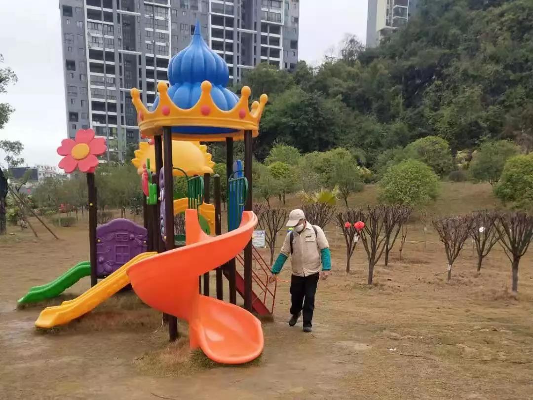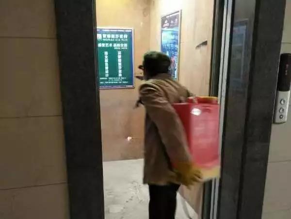 ▲桂醫(yī)·熙境項(xiàng)目對電梯、單元樓大廳、客服中心等地噴灑消毒水。