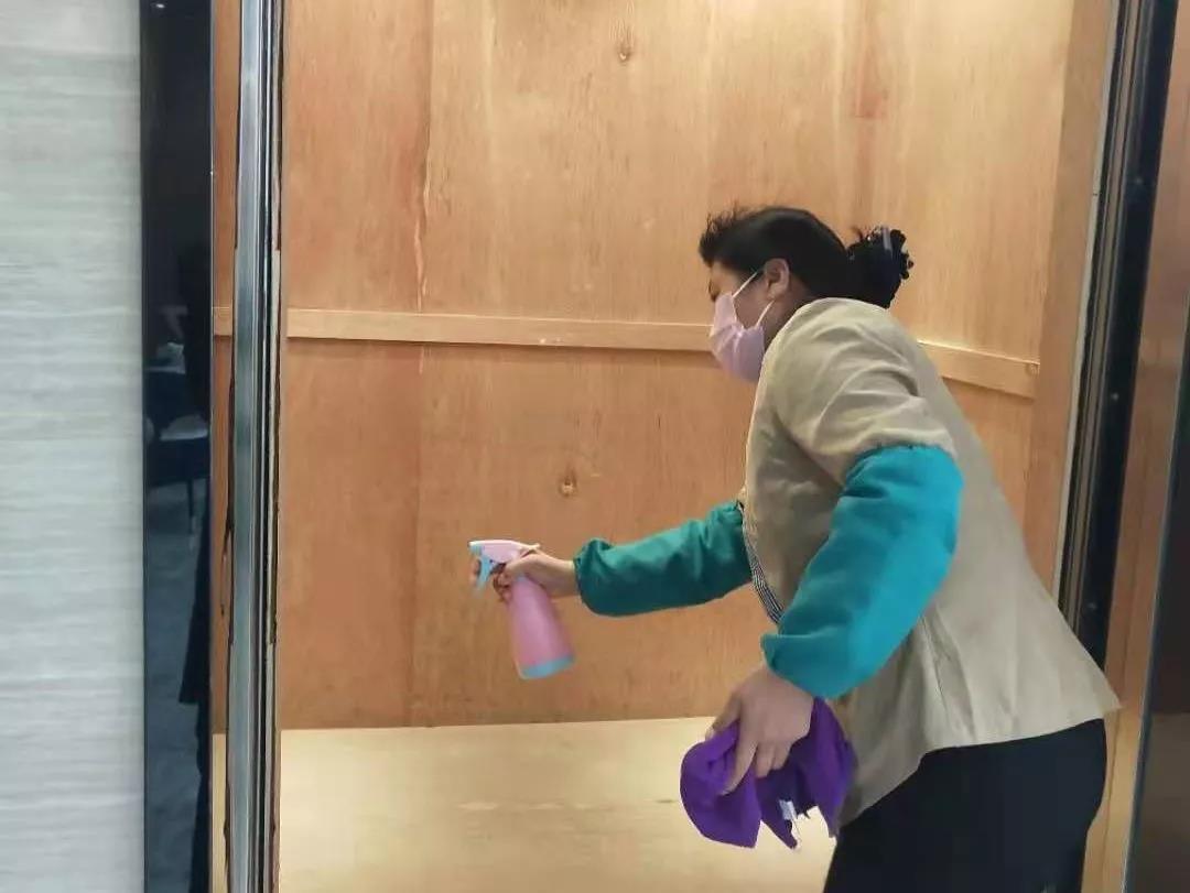 ▲新城投資集團(tuán)辦公樓項(xiàng)目對出入門廳、電梯、門把手、茶水間等位置進(jìn)行重點(diǎn)消毒。