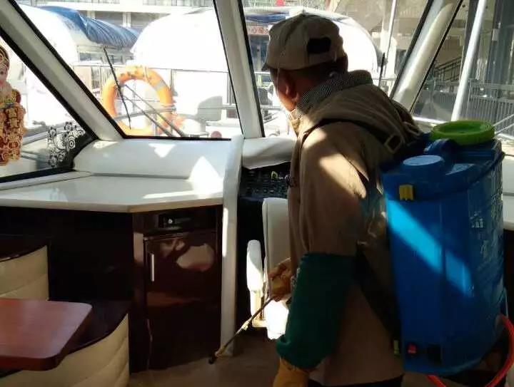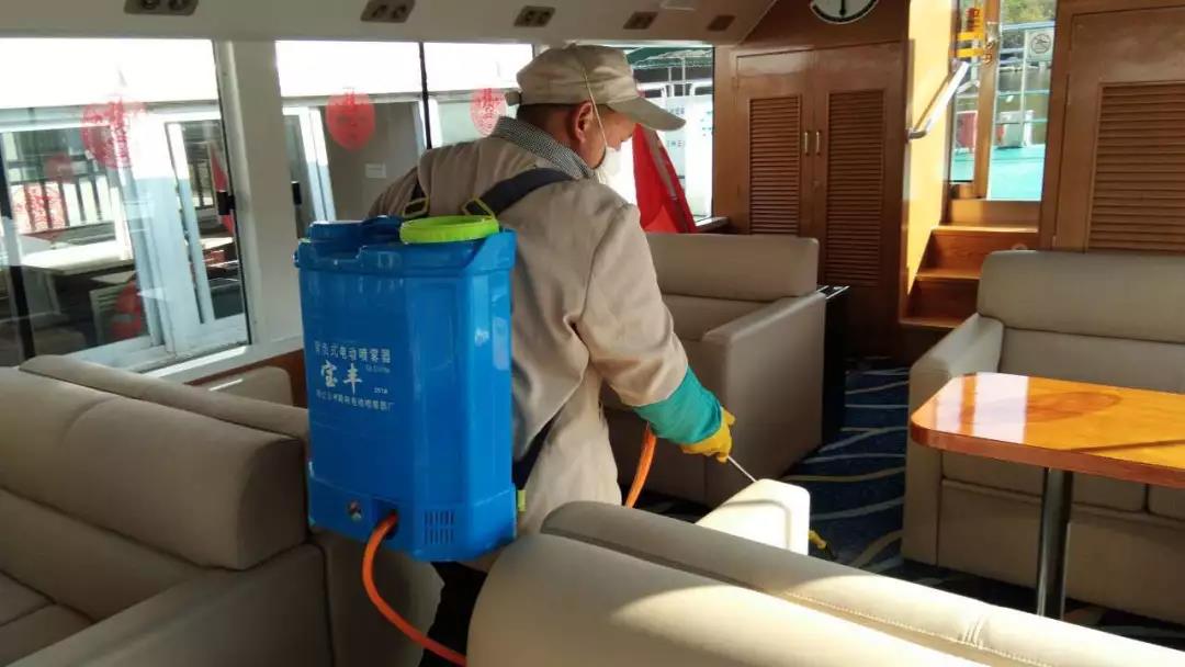 ▲游船項(xiàng)目對碼頭、游船內(nèi)部進(jìn)行消毒。