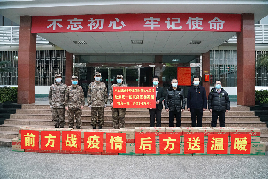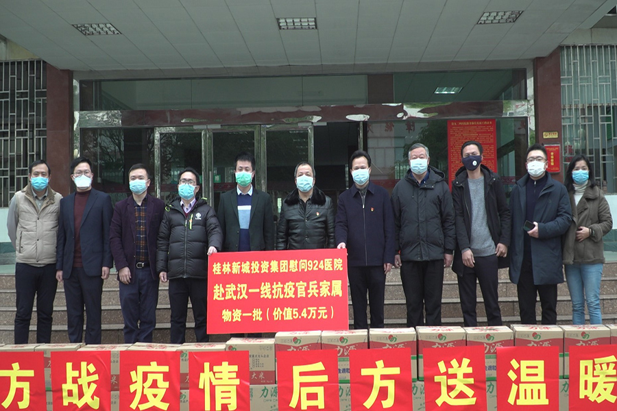 為貫徹落實(shí)習(xí)近平總書記關(guān)于務(wù)必高度重視對(duì)醫(yī)務(wù)人員的保護(hù)、關(guān)心、愛護(hù),從各個(gè)方面提供支持保障,使他們始終保持強(qiáng)大戰(zhàn)斗力、昂揚(yáng)斗志、旺盛精力,持續(xù)健康投入戰(zhàn)勝疫情斗爭(zhēng)的指示精神,2月21日早上9點(diǎn)30分,桂林警備區(qū)、新城投資集團(tuán)在第九二四醫(yī)院辦公樓舉行了“慰問九二四醫(yī)院赴武漢一線抗疫官兵家屬”捐贈(zèng)儀式。桂林警備區(qū)司令員劉禮智,九二四醫(yī)院院長(zhǎng)肖慶、政委易振林,臨桂新區(qū)工委委員、管委會(huì)副主任文杰,新城投資集團(tuán)黨支部書記、董事長(zhǎng)周道林參加活動(dòng)。