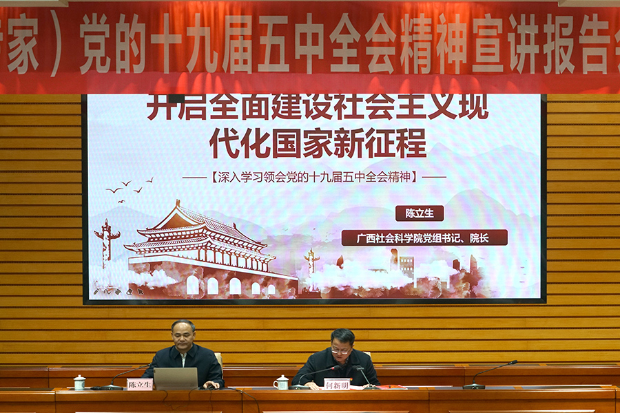 11月27日上午,自治區(qū)黨委講師團(tuán)黨的十九屆五中全會(huì)精神宣講報(bào)告會(huì)在臨桂新區(qū)工委會(huì)議室舉行。廣西社會(huì)科學(xué)院黨組書(shū)記、院長(zhǎng)陳立生作了題為“開(kāi)啟全面建設(shè)社會(huì)主義現(xiàn)代化國(guó)家新征程”宣講。臨桂新區(qū)工委第一副書(shū)記、管委會(huì)主任、臨桂區(qū)區(qū)委書(shū)記何新明主持報(bào)告會(huì),并作臨桂新區(qū)黨的十九屆五中全會(huì)精神學(xué)習(xí)動(dòng)員講話。