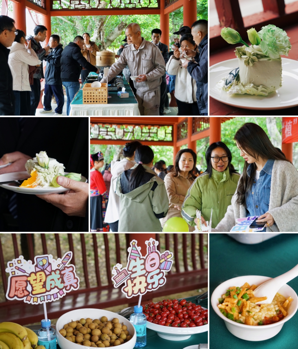 在茶歇環(huán)節(jié)中,弘毅亭長(zhǎng)廊早已擺放著各種精美的點(diǎn)心、水果、飲品,以及桂林傳統(tǒng)非遺“Chinese Coffee”——油茶體驗(yàn)區(qū)。油茶香氣四溢,搭配著甜蜜的蛋糕和繽紛的茶點(diǎn)飲料,讓這場(chǎng)集體生日會(huì)充滿了溫馨與甜蜜。大家圍在一起,品嘗美食,交流心得,歡聲笑語(yǔ)不斷,情誼也在這一刻悄然升溫。隨后,所有人品嘗了由宏謀酒管公司精心制作的生日蛋糕,一同共唱生日歡歌。