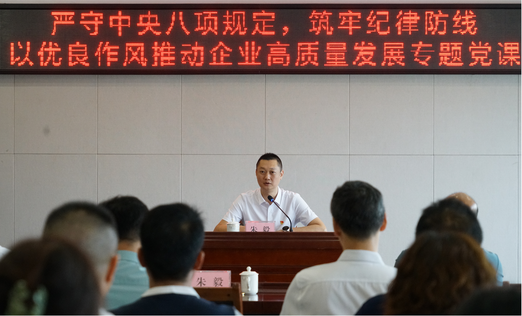 2025年7月8日,集團(tuán)黨委書記、董事長朱毅同志以“嚴(yán)守中央八項(xiàng)規(guī)定,筑牢紀(jì)律防線,以優(yōu)良作風(fēng)推動(dòng)企業(yè)高質(zhì)量發(fā)展”為題,為集體黨員干部講授專題黨課,由集團(tuán)黨委副書記、紀(jì)委書記譚力源主持。此次黨課圍繞理論認(rèn)知、案例警示、實(shí)踐落實(shí)三個(gè)方面展開,深入淺出地闡釋了中央八項(xiàng)規(guī)定精神的豐富內(nèi)涵與重要意義。