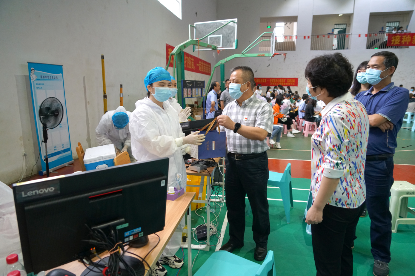 周道林一行在疫苗接種點查看接種情況、在留觀區(qū)詢問完成接種師生的觀察情況,并慰問了各服務(wù)點的醫(yī)護人員,代表新城投資集團和漓江學(xué)院送上護士節(jié)的慰問品和祝福。