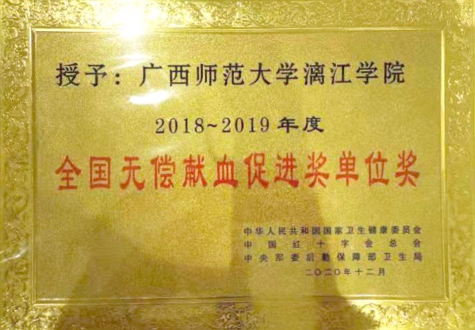 6月9日,由桂林市獻(xiàn)血委員會、桂林市衛(wèi)生健康委員會、桂林市紅十字會、中國人民解放軍聯(lián)勤保障部隊(duì)桂林聯(lián)勤保障中心衛(wèi)勤處主辦,桂林市中心血站、廣西師范大學(xué)漓江學(xué)院承辦的“喜迎建黨100周年桂林市慶祝2021年世界獻(xiàn)血者日無償獻(xiàn)血表彰文藝匯演”活動在漓江學(xué)院召開。漓江學(xué)院獲得全場唯一“全國無償獻(xiàn)血促進(jìn)獎(jiǎng)單位獎(jiǎng)”。