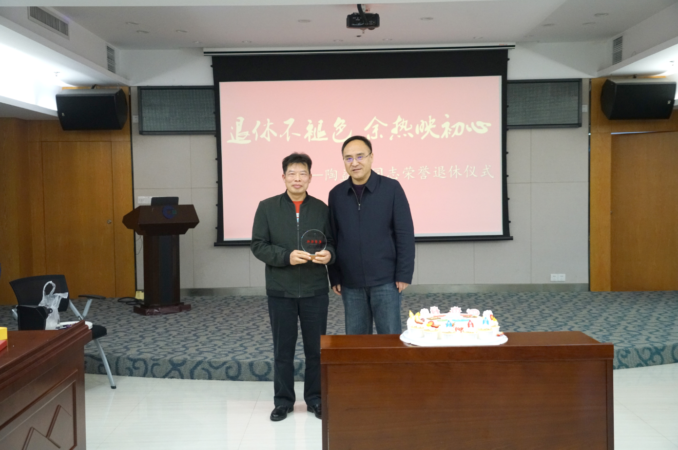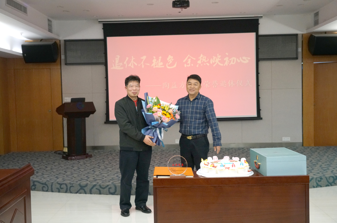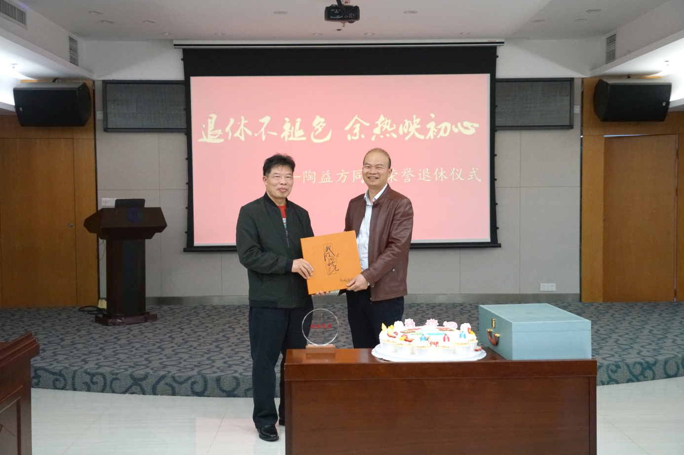 集團黨委副書記兼紀委書記、監(jiān)事會主席、工會主席譚力源向陶益方贈送退休禮物