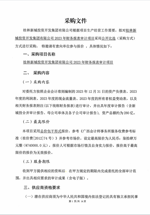 桂林新城投資開發(fā)集團有限公司2023年財務(wù)報表審計項目采購文件