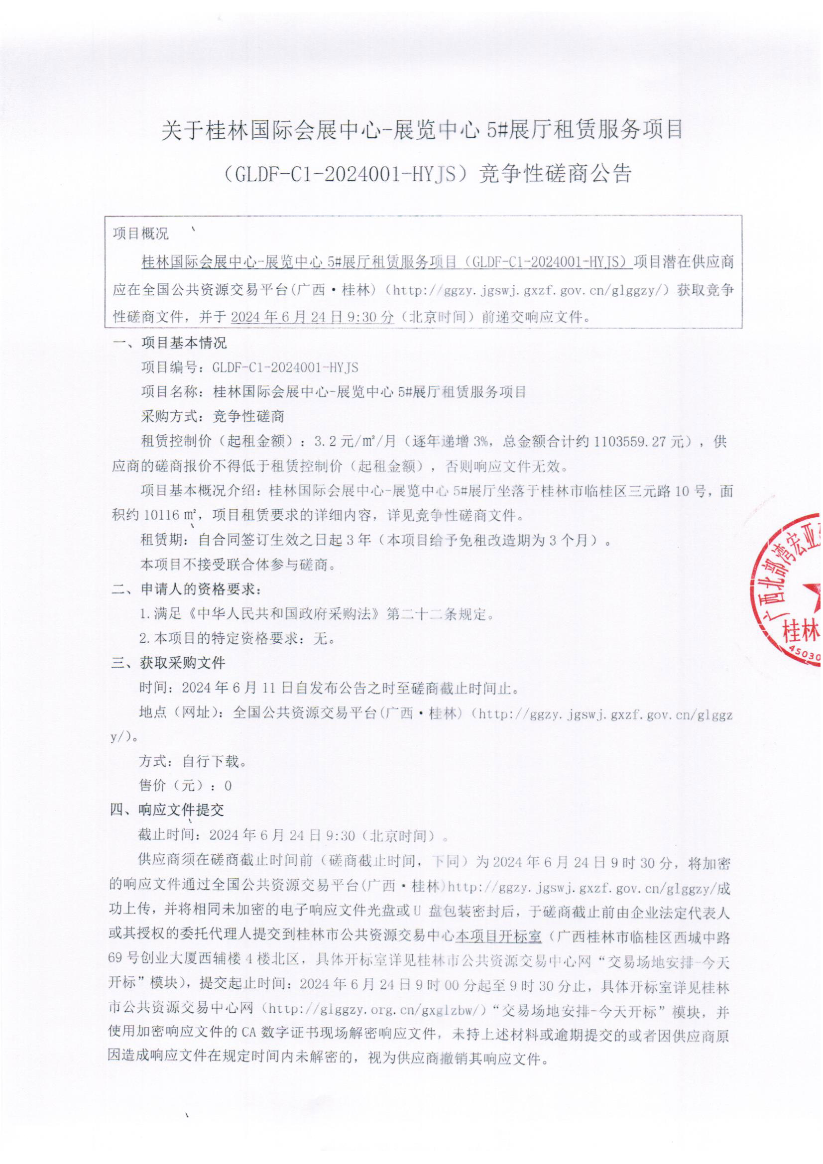 關(guān)于桂林國(guó)際會(huì)展中心-展覽中心5#展廳租賃服務(wù)項(xiàng)目(GLDF-C1-2024001-HYJS)競(jìng)爭(zhēng)性磋商公告