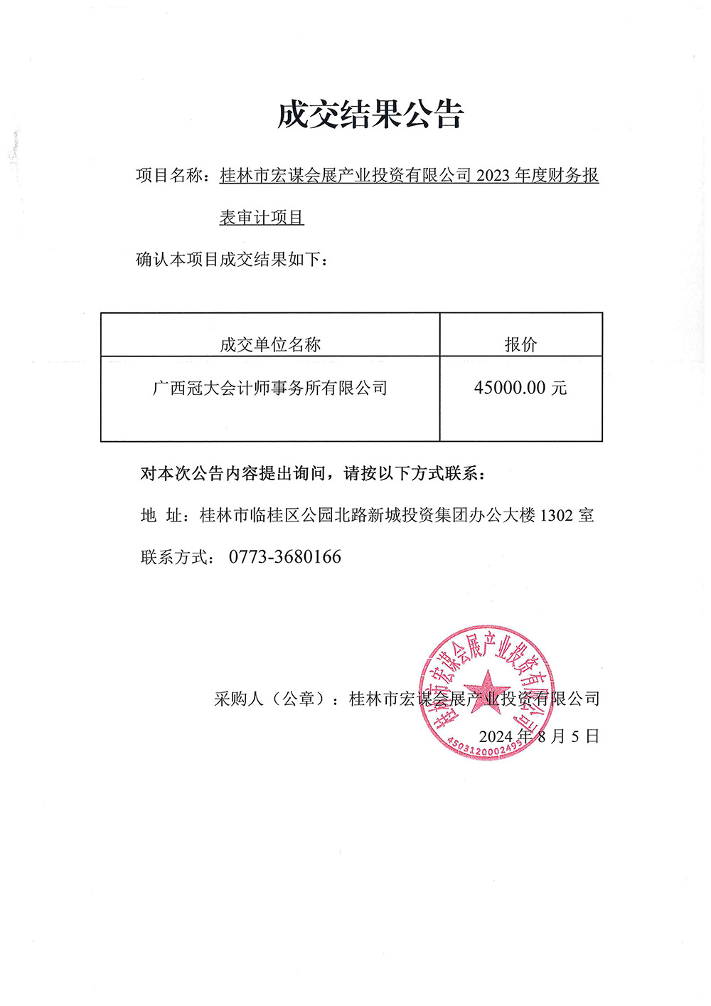 桂林市宏謀會展產業(yè)投資有限公司?2023年度財務報表審計項目成交結果公告