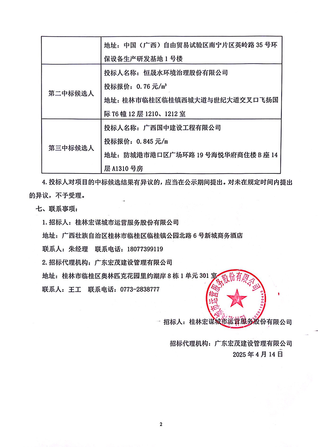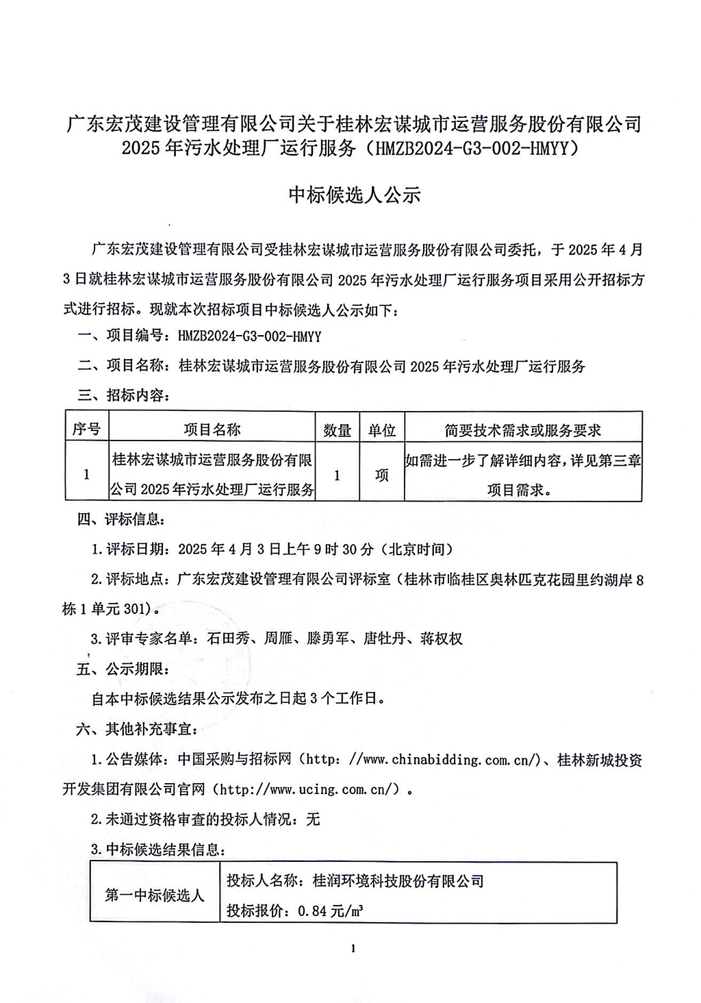 廣東宏茂建設(shè)管理有限公司關(guān)于桂林宏謀城市運(yùn)營(yíng)服務(wù)股份有限公司2025年污水處理廠運(yùn)行服務(wù)(HMZB2024-G3-002-HMYY)中標(biāo)候選人公示