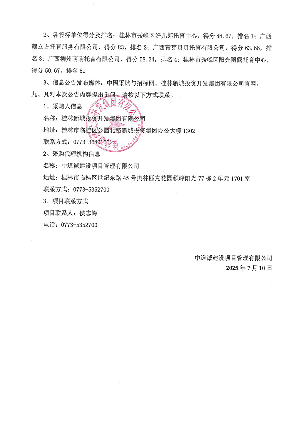 中道誠建設項目管理有限公司關于桂林宏謀普惠托育園運營管理項目(重1)(ZDCJS2025-05-001)中標(成交)結果公告